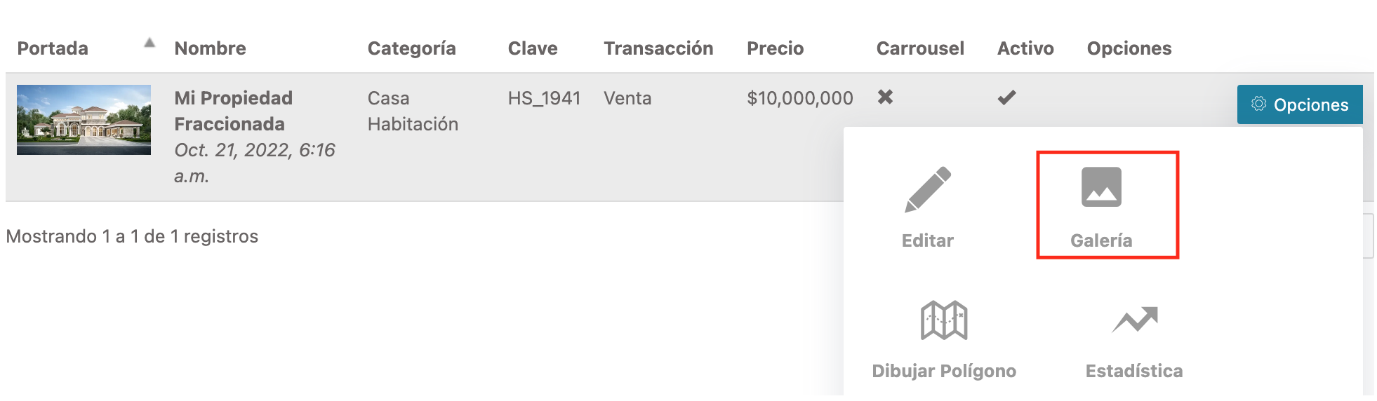 Esta opción también se puede realizar desde el listado de Mis Propiedades en Módulo Propiedades ó Módulo Inmobiliario > Propiedades > Mis Propiedades haciendo click en Opciones > Galería